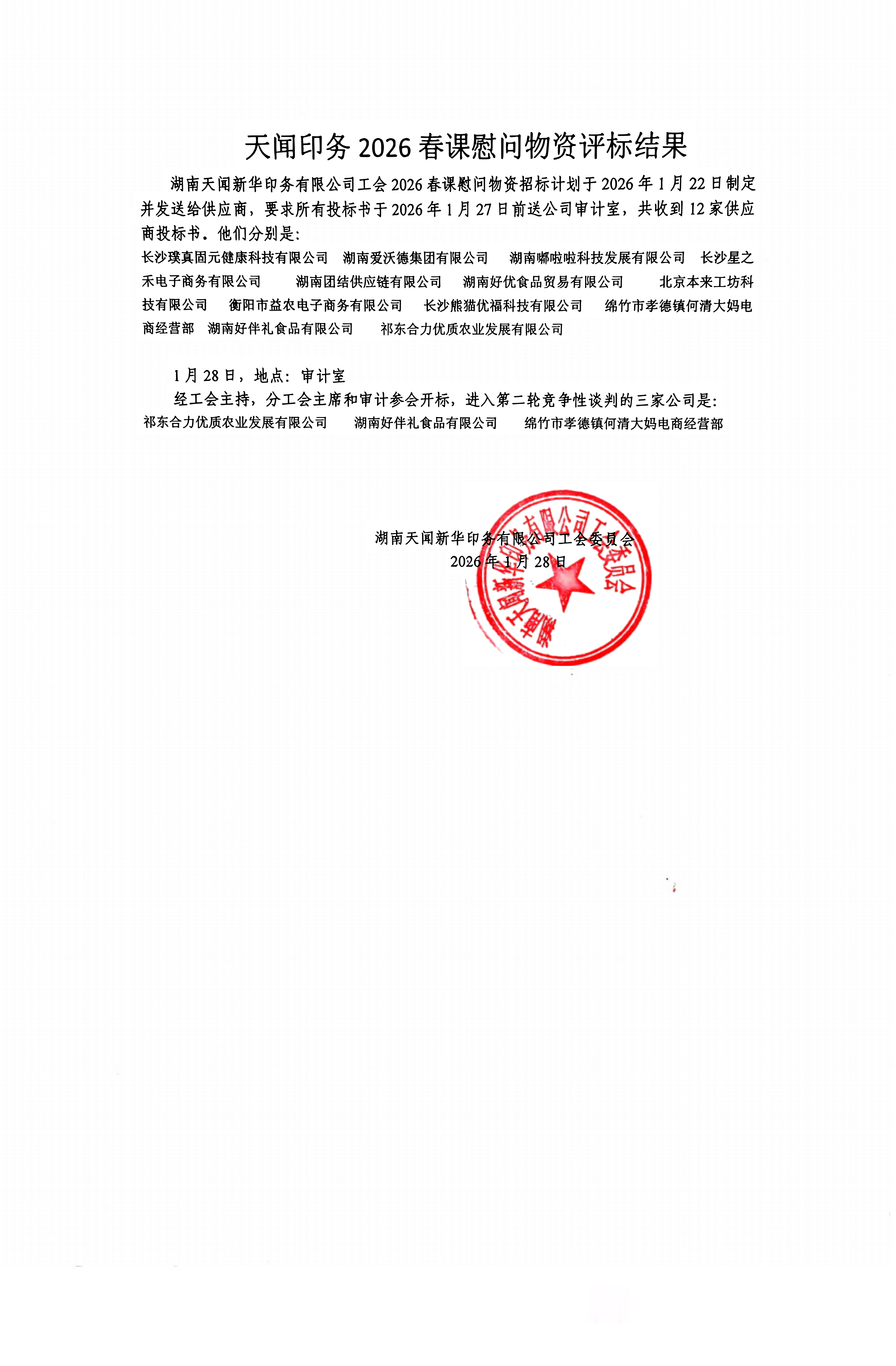 湖南天闻新华印务有限公司工会2026春课慰问物资评标结果(入围)
