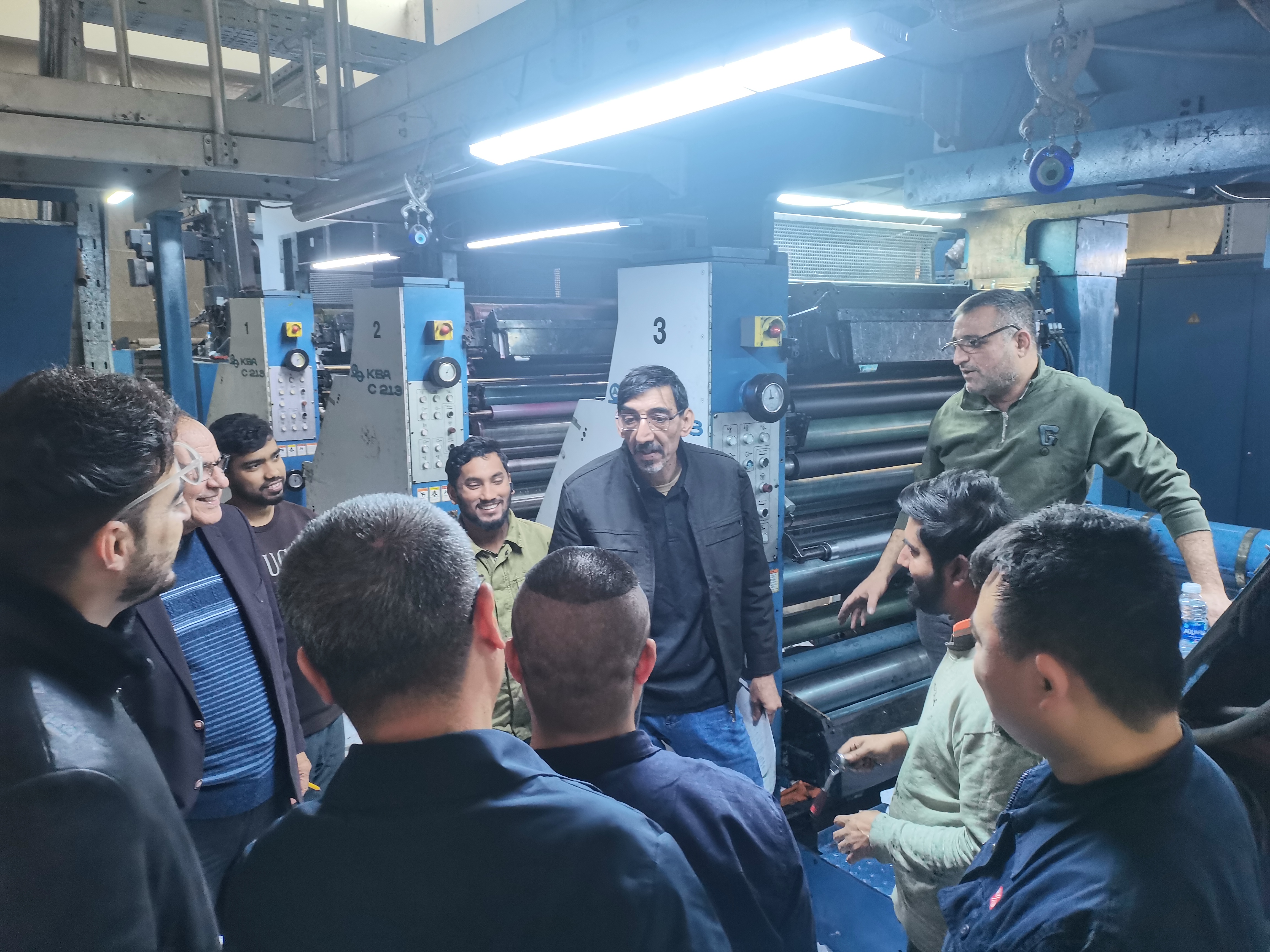 油墨的清香与机器的轰鸣交织,与厂区外尚未完全修复的围墙形成强烈反差。厂长Seeyed热情相迎,指着墙上泛黄的老照片感慨:“上世纪八十年代,这里曾是中东最先进的教材印刷厂之一,一本本教科书从这里发出,送往全国每一所学校。”然而,2003年后的战乱让一切戛然而止,设备损毁、技术断层,近百万儿童因缺乏教材被迫失学。尽管战后人们抢救性保留了部分设备,也添置了一些零散的辅助及单双色印刷设备,但陈旧的设施与落后的技术,终究让工厂难以维系,迫切需要专业的技术支持与深度合作。